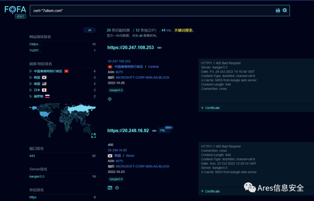 用我的站点举例,由于我的CDN是自建的,所以FOFA扫出了所有的CDN节点,如果源站宝塔没有配置HTTPS防窜站,就可以通过证书搜索到源IP